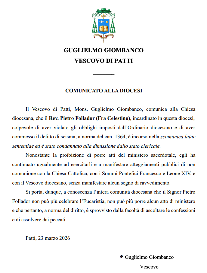 帕蒂教区主教古列尔莫·乔班科蒙席谨向本教区教会通报:本教区司铎伯多禄·福拉多尔(切莱斯蒂诺修士)因违犯教区主教所规定的义务,并犯有裂教之罪,依据《天主教法典》第1364条,已处于自科绝罚,并被判处褫夺圣职身分。